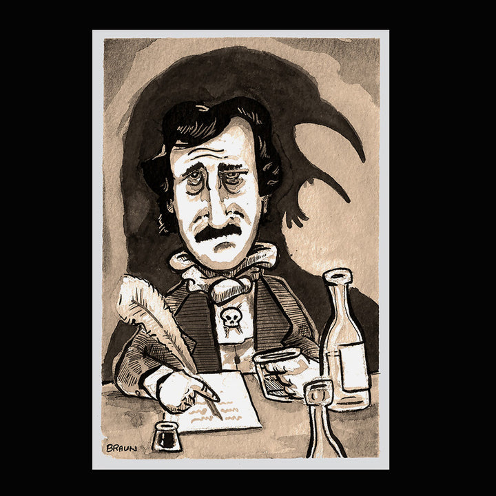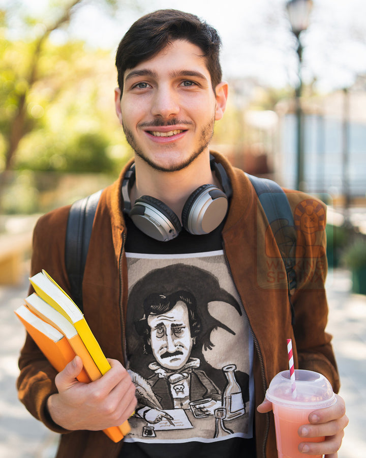 Edgar Allen Poe With Quill Pen and Shadow Raven Sepia-Tone Shirt. Poe is one of the most recognizable faces in American Literature. He is widely recognized as one of the founders of gothic horror and is famous for bizarre tales and ghost stories. Even his 1849 death in Baltimore, Maryland is shrouded in mystery. Great gift for students, teachers, writers, bookworms, nerds, and fans of horror. Men and women can wear it to school, book club, coffee shops, or while enjoying a nice cold absinthe in a candle-lit study within a gloomy country manor on Halloween night. Shirtless nevermore! Featuring original India ink wash portrait by Wisconsin-based artist, Jason Braun. Please see sizing chart in image gallery.